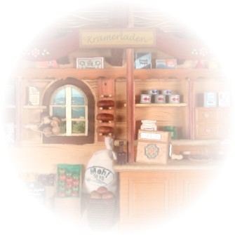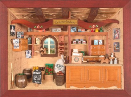 Im “Kramerladen” bekommen Sie nicht nur Sauerkraut oder Gurken direkt aus dem Holzfass, sondern auch Waschmittel, Kirschkonfitüre oder Mehl, alles fein abgewogen - und die Aussicht auf die ferne Hügellandschaft gibt es gratis dazu. Auch das weitere reichhaltige 3 D-Holzbilder Sortiment wird Sie mit seiner detailreichen Ausgestaltung begeistern!